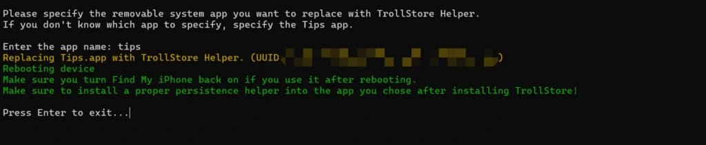 - 确认了你的设备和系统版本正好是使用TrollRestore安装。